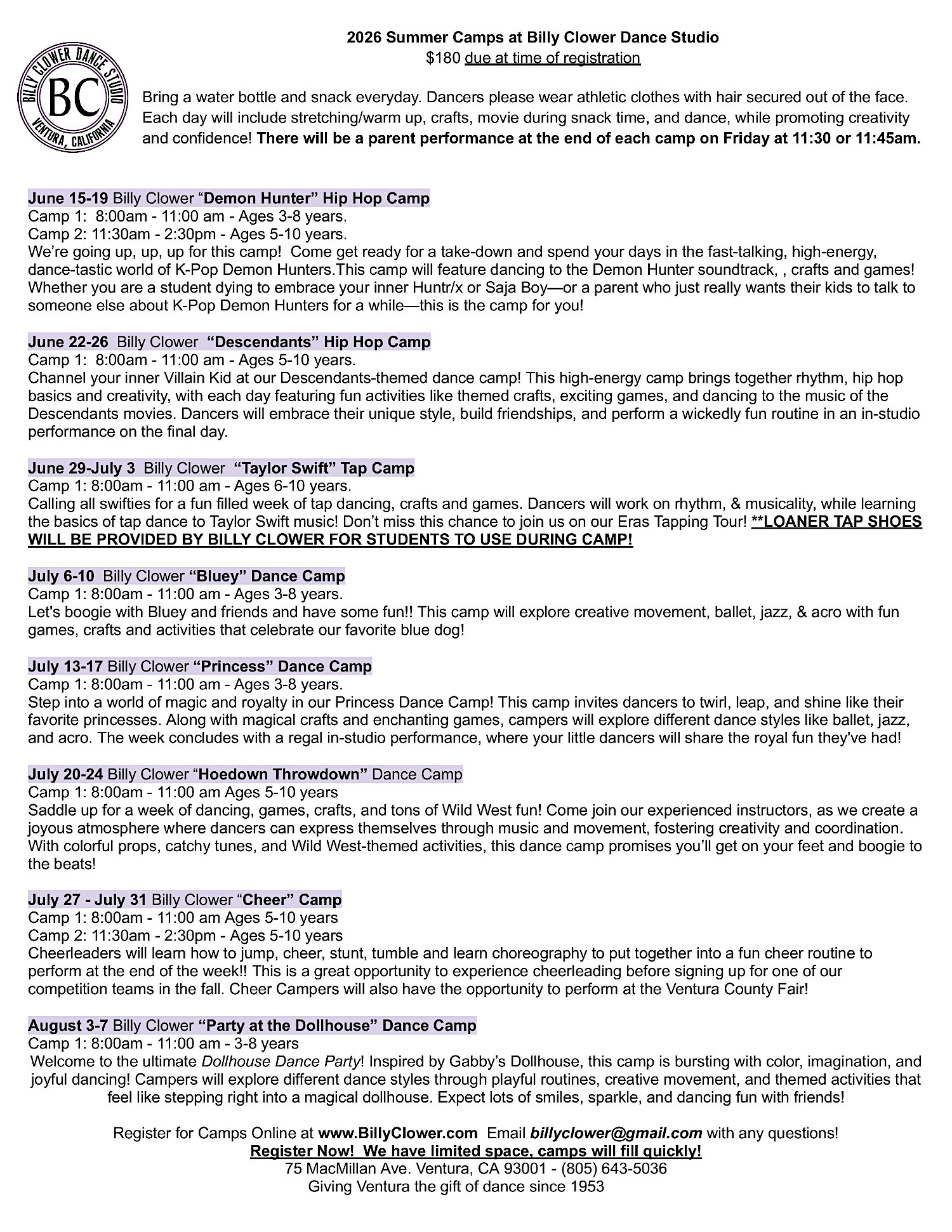 Click Here for 2026 Summer Camp Schedule!